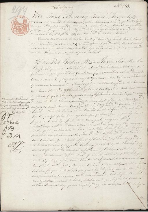 N 53. Transport Voor Isaac Penning Junior, keyzerlyk Notaris resideerende te Schieden Canton Schiedam arrondissement Raller C dam in het departement der monden van de Maas en voor de nagenoemde getuigen Compareerde Jan Vryland Schipper op den Briel wonende te Schie dam aan t' hoofd wyk C N: 59 aan voornoemde Notaris bekend Dewelke verklaarde te hebben verkogt aan Aey Janse Koole Bouw o man wonende te Pernis No. 4 Arrondissement dordrecht, departement als vooren, en deeze accepteerende zyn aandeel en een schepen Schuld rentebrief zynde van de navolgende inhoud Wy Hendrik Bredero Adz en Maximelaan van den Bergh, Schepenen der Stad Schiedam Oirconden en kennen dat voor ons gekomen en gecompareerd is, Gerrit van Capel wonende alhier, Dewelke bekende wel en deugdelyk schuldig te zyn aan en ten behoeven Johannes Speelman wonende te Pernis of zijn recht verkrygende de Summa Van twee duizend Vyf honderd guldens aan dry Janke Loole mede wonende te Teunis of zyn rechtverkrygende medegligke Somma aan Jan Vryland almede of zyn rechtverkrygende # en aan Hendrik Warner wonende te Hoogrleet of zijn rechtsverkrijgende # wonende te Germs id insgelyks eene somma van twee duizend vyf honderd guldens; en dus gelyke somma van Twee Guldens „ approuve aan hun Vieren te Samen Thien Duizend Guldens Sprustende uit hoofde duizend vyf honderd van deugdelyk geleende en op intressen gedane penningen by hem Comparant tot zyn contentement in gaad gangbaar geld genoten en ontfangen afstand doende derhalven van de Exceptien van onaange A Ikoole telden gelde en van alle anderen in rechten bekend belovende hy Com Nots. parant de voorsz: Sommas van Twee duizend vyf honderd guldens D M aan ieder der geme: rentheffers of derzelver recht verkrijgende te zullen voldoen opleggen en betaelen Jaarlyks op den verschijndag B.P. Sr der intressen met een Honderd Vyf en twintig Guldens en dus aan hun Au vierden te samen vyf honderd guldens zullende echter het ge¬ heele Capitaal, of zo daar van was afgelost het resteerende van dien ten allen tyden kunnen worden opgeerscht mits in dat cas den Comparant of elk der geme. rentheffers den een den anderen drie maanden bevoorens waarschouwende en ondertussen van het onafgelosten Capitaal te zullen betalen intressen tegen zes guldens in thien stuivers, dog op den verschyndag der intressen betalende legaen