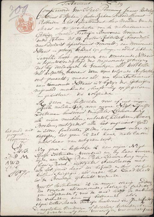 No. 59 Testament Compareerde voor Isaac Penning Junior Keizer sijn Notaris te Schiedam, Cantonschiedam Arrondissemans Rotterdam in het departement der monden van de Maas en ter praesentie van de natenoemene Getuigen Cornelis Fortuijn Bouwman woonende onder Rhoon No 114. Canton Ridderkerk Arnondisse ment Dordreert departement voormelt, aan voornoemde Notaris en getuigen bekend zyn geheugen en oordeel hebbende, Tewelke heeft opgegeeven aan voornoemde Notaris in tegenwoordigheijd der nagenoemde getuigen dat hij declareerde te vernitigen alle uitverste wils dispositien, bevoorens deze zyne volgende dispositie oort gemaakt, maar als nu sijne Testamens aan voornoemde Notaris in 't byzyn der Getuigen nagemeld makende, heeft hy opgegeeven en gedicteert dit volgende Ik geene en bespreeke voor af int myne geheele nalatenschap, aan myne Nigt Lijntje zoeteman huisvrouw van Pieter Leeuwenburg alle mijne meubilen, inboedel, kleederen, linnen Boeken, mitsgaders alle het ongemunt goud en zilver, Contanten gelden daar niet onder te het woord niet begrypen, het geen ik zal komen na te laten geroijeert. Approuve niets daar van uitgezondert. Nog geeve en bespreeke ik aan mijne Nigt L.R H.B. Lyntje Zoeteman, voornoemd en by haar voorover lyden aan haare Man Pieter Leeuwenburg mijn J:V:M haas en Paard, mitsgaders Arresleeden met A W D alle het geene daar toe behoord en dus ook de CtrG kussens en tingagie, als mede het Laadkleed Frey lot de Bouwerije gebruikt wordende. Voorts Institueere ik in myne overige goederen zoo roerende als onroerenden, Actien en Crediten geen uitgezondert, voor de eene helft de natemelde ne vrienden aan mij bestaande als chijne Zuster Maria Forheijn huisvrouw van Jan de Raadt op de nagelatene kinderen of derzelver descendenten van dezelve by haar voorwerlyden voor een derde part
