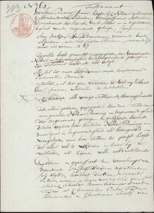 ds 1661. Testament Voor Isaac Penning Junior Keijzerlyk Notaris resideerende te Schiedam canton Scheedam, Arrondissement Rotterdam Departement der Morden van de Masas en in tegenwoor¬ digheid van de nagenoemde getuigen Compareerde Ary Dirkzoon & Mero Bouwman woonende buiten Schiedam, onder het Canton Schedam, Arrondisse ment als vooren N 67. Dewelke heeft gemaakt en opgegeeven aan voornoemde Notaris in tegenwoordigheid der ondergeteekende getuigen, zijn Testament luidende als volgt. Ik stel tot myne Erfgenaame myne huisvrouw Pieternella Brauk enzulks in al het geen waar over de Wet my tollaat ten haaren wordeelen te beschikken Ik herroep alle voorige Testamenten door my gemaekt Deze aldus gedaan, opgegeeven door den Testateur aan gemelde Notaris Penning in teegenwoordigheid der negenoemde getuigen en geschreeven staande dezelve opghve door denzelve Notaris Penning en Vervolgens in tegenwoordigheid als bovengemeld voorgeleezen aan hem Testere die gezegt heeft dit alles wel te verstaan en daarby te volhouden als zijne wille uitdrukkende Gedaan en gepasseert ten woonhuys van voorneemde Arij Dirk Te Herv, den negentienden July Agttien hondert dertien, des avonds ten zeven uuren in tegenwoordigheid van Srs. Fredrik Schurlau Kamerbehanger David Textor mr. Kleermaker Pieter Textor kleermaker en Christiaan Adolf van