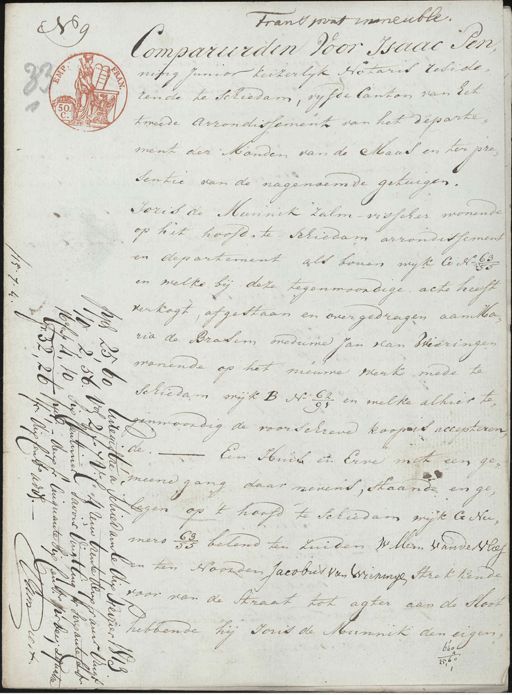 Transport in meuble. N 9 Compareerden Voor Isaac Pen¬ ning Junior Keizerlijk Notaris reside¬ rende te schiedam, vyfde Canton van het tweede Arrondissement van het departe¬ ment der Monden van de Maas en ter pre¬ sentie van de nagenoemde getuigen. Joris de Munnik zalm - visscher wonende op het hoofd te schiedam arrondissement en departement als boven wyk @ No. 63 55 en welke bij deze tegenwoordige acte heeft verkogt, afgestaan en overgedragen aan Ma¬ ria de Brasem weduwe Jan van Wieringen Een wonende op het nieuwe werk mede te schiedam wijk B N. 62/91 en welke alhier te¬ genwoordig de voorschreve koopus accepteren de. Een Huis en Erve met een ge¬ meene gang daar nevens, staande en ge¬ legen op 't hoofd te schiedam wijk ce Nu¬ S - mero 63 ende 55 belend ten zuiden Willem van der Vlieg en ten Noorden Jacobus van Wieringen Strekkende voor van de straat tot agter aan de sloot hebbende hij Joris de Munnik den eigen¬ (25,60 de