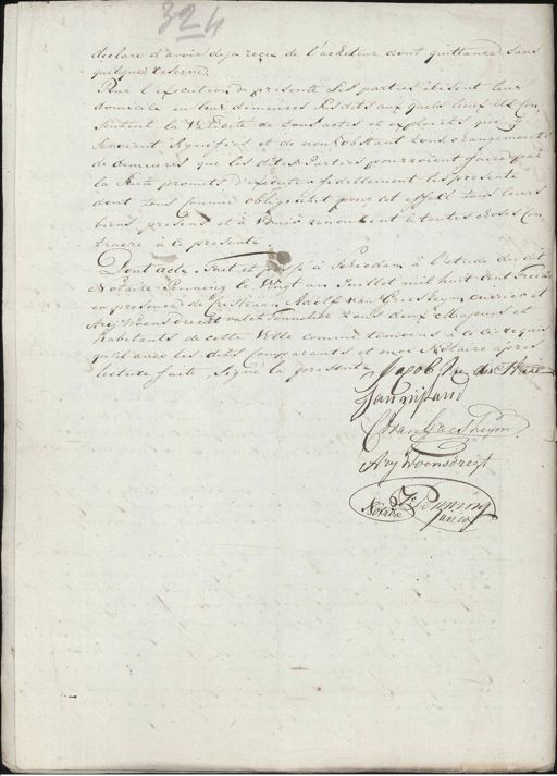 4 declare d'avoir deja reçu de l'acheteur dont quittance sans quelque reserve. Pour l'execution de presente les parties élisent leur domicile en leur demeures sus dits aux quels lieux ils con¬ sentent la validité de tous actes et exploicts qui y servient signifiés et de non: obstant tous changements de demeures que les dites Parties pourroient faire par la suite promets d'executer fidellement les presente dont tous somme obligeant pour cet effekt tous leurs biens presens et à venir renoncent a toutes choses con¬ traire à ce presente Dont acte. Fait et passé à Schiedam à l'étude du dit Notaire Penning le Vingt un Juillet mil huit Ant Freize en presence de Cristiaan Adolf van Griesheijm ouvrier et Arij Woensdrecht valet Tonnelier tous deux Majeurs et habitants de cette Ville comme temoins à ce ci-requis qu'il avec les dits Comparants et moi Notaire apres lecture faite, signé la presente Jacob Jan des Haal Jan Mijland Fran Gries Heijm Ary Woensdregt J:l Pennin Notaire Juni dine