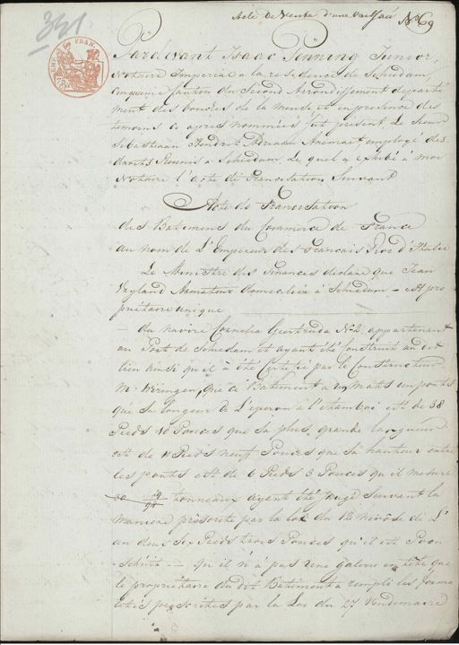 Acte de Venke d'une vaissau No 69 Pardevant Isaac Penning Junior, Notaire Imperial a la résidence de Schiedam, Cinquieme Canton du second Arrondissement departe ment des bouches de la mense et en presence des temoins ci apris nommées fut present, Le sieur Sebastiaan Hendrik Adriaan Aremaet, employé des droits Reunis a Schiedam. Le quel a exhibé a moi Notaire l'Acte de francisation suivant Acte de Trancisation des Batimens du Commerce de France au nom de L'Empereur des Français Roi d'Italie Le Ministre des finances declare que Jean Vryland Armateur domicilice a Schiedam - est pro¬ priétaire unique du navire Cornelia Geertruda N-2 appartenant au Port de Schiedam et ayant été Construit au dit lien ainsi qu'il a eté Certifié par le Construcheur M. Wiringen, que ce Batiment a un Mats un ponts que sa longeur de L'eperon a l'etamboi est de 38 Pieds 10 Pouces que sa plus grande langueur est de 11 Pieds neuf Pouces que sa hauteur entre les ponts est de 6 Pieds 3 Pouces qu'il mesure 94 tonneaux ayant été Jange suivant la 30 „ maniere proscrite par la loi du 12 Nivose de L een deux six Pieds trois Ponces qu'il est Poon „ Schuit Qu'il n'a pas une galerie en tête que le propriétaire du dit Butiment a rempli les forma litées prescrites par la Loi du 27 vendemaire