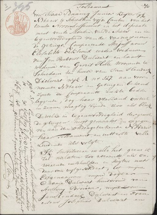 Testament 70 Voor Haae Penning Junior Keyserlyk Notaris te Schiedam vijfde Canton van het tweede Arrondissement in het departe ment van de monden van de Maas en in tegenwoordigheid van de vier nagenoem¬ de getuigen Compareerde Mejuff nouw Elisabeth Eekhoud eerder weduwe van Jan Babtist Dielwart en laast weduwe van Gerrit Hille woonende te Schiedam ten huise van Jan Hendrik Dielwart wijk A no. 127. aan voor¬ noemde Notaris en getuigen bekend zynde de Comparante ziekte bedde leggende, dog haar verstand oordeel en zinnen magtig zijnde, zoo als bleek 1e Dewelke in tegenwoordigheid der gemel¬ de getuigen heeft gemaakt en opgegee¬ ven aan den ondergeteekende Notaris haar Testament en uitterste wille de luidende als volgt 3. § 8/8 Ik Institueere in alle het geene ik Ede. 1 id zal nalaten zoo roerende als on¬ roerende inschulden en Regten niets 2 X 4 daar van uytgesondert, tot mijne 27/1 Erfgenaamen myne dogter Maria Dielwart huisvrouw van Anthonij Brouwer, myne Loonen Jan Hendrik Dielwart en Fran¬ No ciscus Josephus Dielwart en H. de f. V