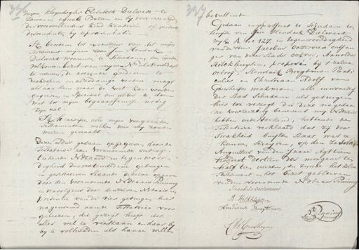 399 myne kleyndogter Elisabeth Deelwart te zamen in equale Portien en by voor overlyden des vooroverleedens Kind Kinderen of verdere descendenten by representatie Ik benoem tot executeur van dit mijn Testament mijnen zoon Jan Hendrik Dielwaert woonende te Schiedam, ten eijnde volkomen bezit van mijnen Nalatenschap te neemen, de roerende goederen te verkoopen en alzodanige verdere magt als aan hem naar de wet kan worden gegeeven, en speciaal om alles te doen wat tot mijne begraaffenisse nodig zyn zal: In keuroepe alle mijne voorgaande Testamenten welke door my zoude weezen gemaakt. bevattende Gedaan en gepasseert te Schiedam ten huijse van Jan Hendrik Dielwart wyk A. no. 127. in tegenwoordigheid van de Heer Jacobus Oosterveen ontfan¬ ger van dezer stads octroij, Arnoldus Hilckhuysen, prepose bij 't zelve octroij, Hendrik Bregtman Parti culier en Christiaan Adolf van Griesheijm werkman, alle inwoonden der Stad Schadam als getuigen hier toe verzogt die deze nagedaa¬ ne voorleezing benevens mij Notario hebben onderteekend, hebbende de Testatrice verklaard dat zij door Swakheid buyten staat was te Deze aldus gedaan opgegeeven door de Testatrice aan voornoemde onderge¬ teekende Notaris in tegenwoor¬ digheid der natemeldene getuigen en geschreeven staande dezelve opgave door den voornoemde Notaris Penning en vervolgens door denzelven Notaris in presentie van de vier getuigen hier na genoemd aan de Testatrice voor geleezen, die gezegt heeft dit alles wel te verstaan en daar by by te volhouden als haare willen kunnen schrijven, op den Zesden Augustus van den Jaare Agttien hondert dertien des morgens ten half tien uuren, en zynde het zelve Testament in het bezit gebleeven van den voornoemde Notaris Penning Jacobus Oosterveen A: Hilkhuijsen Hendricus Bregtman Henning Notaris Junior CAVGriesheyn