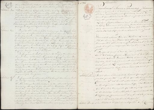 Fraduction dien schil zullen toebehoren aan de Heer Bruide vom die gehen N.o 82 Gesch S den zal zyn alle lasten en Onkusten des aangaande te verzongen Pardevant Isaac Penning Junior Articul Drie De aanstaande Egtgenoten zullen niet aansprakelyk zyn Notaire Imperial à la résidence de Schuldam, Canton schiedam, arrondissement Rotterdam, dans le depar¬ wegens elkanders schulden in Hypotheecquen voor de voltrek king van hun Huwlyk gemaakt en gevestigd nog zelfs voor die tement des Bouches de la Meuse en presence des te 40 geenen welke door hen staande dit huwelijk zullen mogen ge moins ci-après nommées contracteerd worden maar zullen betaald worden door den Le Sieur Casper Bouwer veuf de Dame Thomari geen die dezelve gecontracteerd zal hebben en uit de goederen denzelven persoonlijk toebehorende zonder dat de ander na Eland Receveur des ancien Contributions à Schie dam, demeurant à Schiedam rue dit Hoogstraat deswegens enigzints gehouden zyn zal fection Ee N= 36 stipulant en son nom d'une part Articul Vier Dewyl de Tameellieraad, der minderjarige zoon uit het Eerste huwlyk van de Juffrouw Brind met wyle de Heer Jan Diederik de Graaff gesproten en door haar Comparante by een geroepen zynde Demoiselle Anna Van der Valk Veuve avec un by deszelfs besluit van den Elfden Augustus Agttien honderd fils, du sieur Jan Diederik de Graaf, particuliere dertien gehouden ten overstaan van den Heer Vrederechter van demeurant à Schiedam au Canal section E N- 5, sti¬ het Canton Schiedam en geregistreerd als cheedam den Elffden Au pulante aussi en ces presentes en son nom, d'autre guistres aghtien honderd dertien vol 1 fo 89 7o C 3 ontfangen Twee Francs en twee en Vyftig Centenus, de rime et Additionel part. Les quels dans la vue du mariage Convenu er¬ compris (was getekend) van Diest. tre le dit Sieur Casper Bouwer et la dite Demoi¬ De Comparante heeft gelaten in de voogdij over dezelve moiselle Anna van der Valk et dont la celebra haare Zoon Nicolaas Margaretus de Graaf en hem Heer tion sera faite incessamment dans les formes pres¬ Bruidigom heeft benoemd tot mede voogd voor de gemelde zoon is men voereengekomen dat voornoemde zoon zal worden crites par la Loi auparavant fait et arretés opgeroed, onderhouden en eene behoorlyke opvoeding genieten les conditions de leur futur mariage ainsi qu'il zal, ten huize van hun Comparanten uit de vruchten welke de Brind Jaarlyks geniet als mede Entgenaame van wyle der¬ Heer Jan van der Valk en het overige tot onderhoud van het suit. article Premier Le dit sieur et Demoiselle futurs époux, dérogent gezamentlyke hintgezin par ces presentes aux Lois qui etablissent une Articul Vyf De Comparante aanstaande Bruid brengt van haaren kant Communauté des biens entre mari et femme tot het tegenwoordig Huwlyk aan en consequence ils declarent, qu'ils veulent 1:o Alle zodanige vruchten renten en inkomsten als uit de na¬ latenschap van wylen de Heer Jan vander Valk door Re Execu¬ que l'union conjugale qu'ils se proposent teurs van deszelfs Testament en administrateurs dier de Contracter ensemble, soit exclusive de tou¬ guaderen zynde als nu de Heeren Cornelus Guarnerus Schoorn Jan Loop uijt en Simon-Wolebruik wonende te Schiedam van te espece de Communauté des biens sauf nean¬ tyd tot tyd worden verantwoord als mede kleederen Linnen moins, les modifications ci-après en andere stoffen ten gebruite van de Juffrouw Brind, bedde¬ Meubilen, dienende tot stoffeering en huis houding van het article Deux Non Obstant l'exclusion stipulée de la Commu¬ stuis bij haar tans beroond wordende alles opgegeven en ge¬