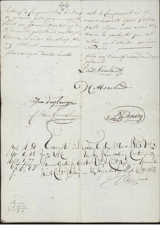44 hebben de Comparanten benevens ont le Comparant et te¬ de gemelde getuigen en mij No¬ moins susdits apres lecture taris na gedaane voorlezing de¬ faite Signe avec moi No¬ ze minute getekend welke ge¬ taire la presente qui est bleeven is onder berusting van restée en l'étude de moi mij Notaris. Notaire. folio un raijee douze mots. folio een twaalf woorden door gehaald. P. Leendt Maarlandt Ik Haarlandt Jan duytemger J A van Griesheijm Henning Notaire Junior ƒ Enregistré à Schiedamli Six Mars 1813 V.Z. syd. 4,80. Uw six frans Cinq Centimes 10. 0, 48 fo. 20 Vo. 16eembr. 0,77 Lavor Quatre frs. Quatte Vingt Cent ppt. Quarante 6,05 huit Cents. perdeij - & sonpantelu sept Cents adden I am Sirs ƒ 3„ 2. 17. 10. 26