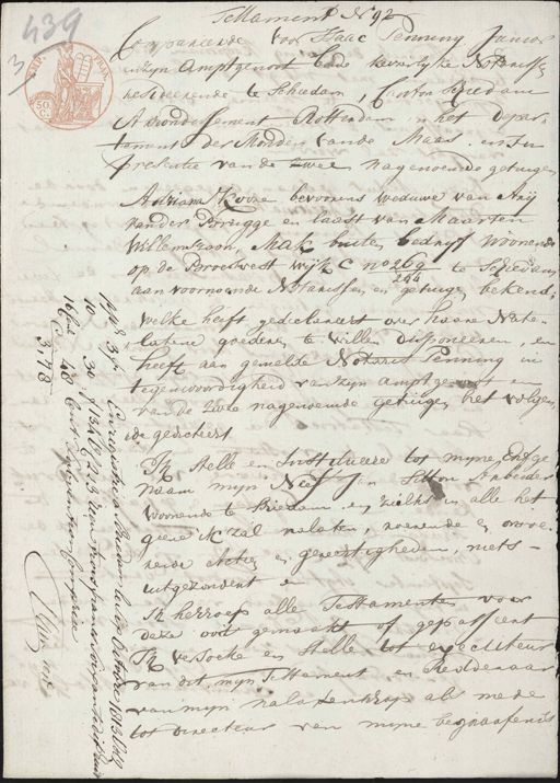 Testament No 92 Compareerde voor Haar Penning Junior en zyn Amptgenoot beide keverlyke Notarissen resideerende te Schieden, Canton Schiedam Arrondissement Rotterdam in het depar¬ tements der Monden van de Maas en ter presentie van de twee nagenoemde getuigen Adziana Koore bevoorens weduwe van Arij vander Brugge en laast van Maarten Willemszoon, Mak buiten bedrijf woonende op de Broesvest wijk C No 269 te Schiedam 244 aan voornoemde Notarissen en getuigen bekent; welke heeft gedeelareert over haare Nate¬ latene goederen te Willem disponeeren, en heeft aan gemelde Notaris Penning in 3 en tegenwoordigheid van zyn ampt genoot van de twee nagenoemde getuigen het volgen¬ ede gedicteert In stelle en Institueere tot myne Erfge¬ naam myn Neef Jan Sillon Arbeider woonende te schieden en zielks in alle het geene ik zal nalaten, roerende en onroe¬ rende Actien en gerechtigheden, niets - uitgezondert en In herroep alle Testamenten voor deze oost gemaakt of gepasseert Jk versoeke en stelle tot executeur van dit myn Testament en Redderaar van mijn nalatenschap als mede tot directeur van myne begraafenis