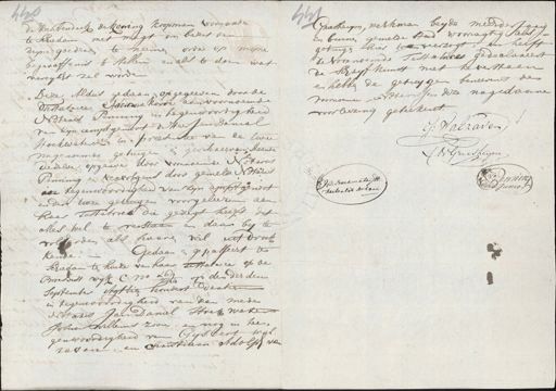 L 40 de Heer Hendrik de Koning koopman woonende te schiedam met magt om bezit van myne goederen te neemen ordre op myne begraaffenis te stellen en als te doen wat nereijscht zal worden Deze Aldus gedaan en opgegeeven door de Testatrice Adriena koore aan voornoemde Notaris Penning in tegenwoordigheid van zyn aemptgenoot de Heer Jan Daniel Hoekwater Mz en in preesentie van de twee nagenoemde getuigen en geschreeven staande dezelve opgaave door voornoemde Notaris Grutheym Wethman beyde meerderjarig en binnen gemelde stad woonagtig als getuigen hier tot verzogt, en heeft de Voornoemde Testatrices gedeclareert de schryfhunst niet te verstaan en hebben de getuygen beneevens de voornoemde Notarissen deze nagedaane voorleezing geteekent. G: Walraven, F. N. Griesheym Henning J: D: Hoekwater J.H. Notaris Junior keckerlijk notaris) Penning en vervolgens door gemelde Notaris in tegenwoordigheid van zyn appt genoot en der twee getuigen voorgeleezen aan haar Testatrice die gezegt heeft dit alles wel te verstaan en daar by te volgenden als haaren wil uitdruk Gedaan en gepasseert te kende. Schiedam ten huize van haar Testatrice op de Broesvest wyk C no 269 244 op den derden September Agttien hondert dertien in tegenwoordigheid van den mede Notaris Jan Daniel Strek water Johia Willems zoon. en nog in tee¬ genwoordigheid van Gysbert Wal. raven en christiaan Adolph van