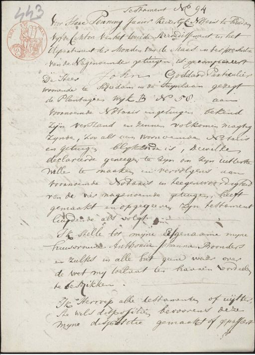 Testament No. 94 41 Voor Haar Penning Junior Keizerlijk Notaris te Schildam Vyfde Canton van het tweede Arrondissement in het departement der Monden van de Maas in ter presentie van de Nagenoemde getuigen is gecompareert John Goddard Particulier De Heer woonende te Schiedam in de Tuynlaan gezegt de Plantagie wyk B N 58. aan voornoemde Notaris en getuigen bekend zijn verstand en zennen volkomen magtig zynde, zoo als aan voornoemde Notaris en getuigen blykende is, dewelke declareerde geneegen te zyn om zyn uitterste wille te maaken en vervolgens aan voornoemde Notaris in teegenwoordigheid van de vier nagenoemde getuigen, heeft gemaakt en opgegeeven zijn testament luydende als volgt Ik stelle tot mijne besgenaame myne huisvrouwe Anthonia Johanna Boonders en zulks in alle het geene waar over de wet my toelaat ten haaren word eele te besdikken. Ik Herroep alle testamenten of uijtter ste wils dispositien bevoorens deze myne dispositie gemaakt of gepasseert