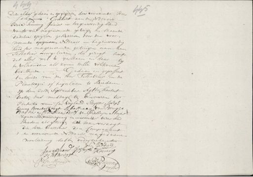 Maas 245 Deze aldus gedaan en opgegeeven door voornoemde Heer sohn - Goddart aan den Notaris Isaac Tenning Junior in teegenwoordigheid van de vier nagenoemde getuigen en staande dezelve opgave geschreeven door den voor¬ noemde opgaven Notaris in tegenwoordig heid der nagenoemde getuigen aan hem Testateur voorgeleezen, die gezegt heefs dit alles wel te verstaen en daar by te volhanden als zynen wille volkomen Gedaan en gepasseert bevattende ten huize van den Heer Testateur in de Plantagie of tuynlaan te Schiedam. op den zesden September Agttien hondert dertien des middags ten Een uuren ter Presentie van Jan Vrijland Schipper, Joseph Koning Breuder Kregt Sebastiaan van Brugge Barbier en Christiaan Adolf van Grietheym arbeijer zynde alle meerderjarig en inwoonders dezer Stad schieden als getuigen hier toen verzogt die deze beneevens den Comparant en voornoemde Notaris na gedaane voorleezing hebben onderteekent John Goddard „ Jan vijland Joseph Koning se de Bruggen C H Grietheyn Notaris Henning Junioen