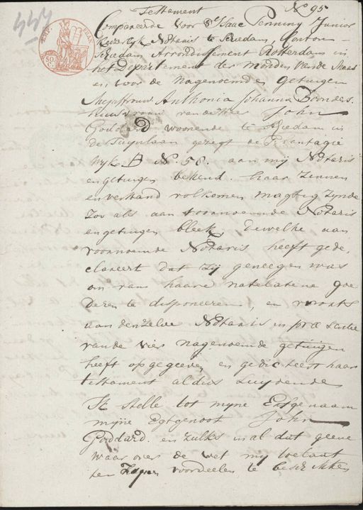 No 95 Testament Compareerde voor Isaac Penning Junior hij Kiezerlyk Notaris te Schiedam, Conton Schiedam Arrondissement Rotterdam in het Departement der monden van de Maas en voor de nagenoemde getuigen Thejuffrouw Anthonia Johanna Boonders. John huurvrouw van de Heer Goddard woonende te Schiedam in de Tuynlaan gezegt de Plantagie Wijk B N. 58. aan mij Notaris en getuigen bekend. haar zinnen en verstand volkomen magtig zynde zoo als aan voornoemde Notaris dewelke aan en getuigen bleek. voornoemde Notaris heeft gede¬ clareert dat zij geneegen was om van haare natelatene goe¬ deren te disponeeren, en voorts van denzelve Notaris in præ sentie van de vier nagenoemde getuigen heeft opgegeeven en gedicteert haar testament aldus Luydende Ik stelle tot myne Erfgenaam John mijne Egtgenoot Goddard. en zulks in al dat geene waar over de wet my toelaat ten Zynen voordeelen te beschikken