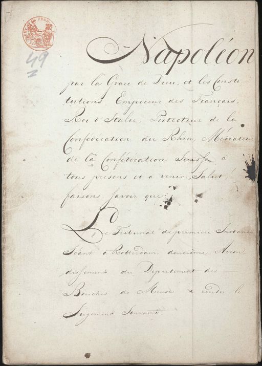 7 Papol 47 Loon 2 par la Grace de Dieu, et les Consti¬ tutions, Empereur des Français, Roi d'Italie, Protecteur de la Confédération du Rhin, Mediateur de la Confédération Suisse à tous presens et à venir, Salut faisons savoir que de De Tribunal de premiere Instance Séant a Rotterdam, deurième Arron dissement du Departement des Bouches de Meuse a rendu le Jugement Suivant.