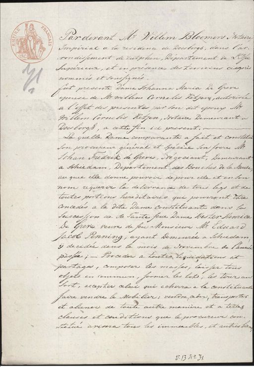 Par devant Mr. Willem Bloemers Notaire Impérial a la résidence de Doesborgs, dans l'ar- rondissement de zutphen, Département de Lisse supérieur, et en présence des témoins ciages, nommés et soussignés. fut presente Dame Johanna Maria De Greve eponse de Me. Willem Cornelis Ketzen, autorisée a l'effet des présentes par son dit époux Mr. Willem Cornelis Ketjen, Notaire Demeurant a Does borgh, a cette fin ici present. La quelle Dame comparante a fait et constitue son procureur général et spécial son frere Mr. Johan Fredrik de Greve, Negociant, Demeurant a Schiedam, Departement des Bouches de la Meuse, au quee elle donne pouvoir de pour elle et en son nom requerir la delivrance de tous legs et de toutes portions hereditaires qui pourront être concedés a la dite Dame constituante dans la succession de sa Tante feue Dame Hester Henrica De Greve veuve de feu Monsieur M. Eduard Jacob Penning, ayant Demeuree a Schiedam ij decidée dans le mois de Novembre de l'année passée; — Proceder a toutes liquidations et partagés, composer les masses, laisser tous objets en commun, former les lots, les tirer au sort, accepter celui qui echerra a la constituante faire vendre le Mobilier; vendre, ceder, transporter et aliener de toute autre manière et a telles clauses et conditions que le procureur con¬ „stitue avisera tous les immeubles, et autres bien V. 13 No 3