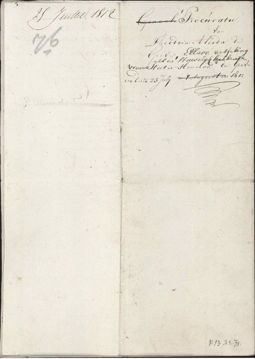 25 Juillet 1812 Genaale Procuratie van Theodora Aleida de Greve Ellard Wesseling als in stuwelyk hebbende vrouwe Hester Henrica de Greve in dato 25 Julij in 4 August in 1812 v. 13 No 31.
