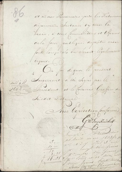 86 et a nos Procureurs près les Tribunaux de premiere Instance d'y tenir la main, a tous Commandans et Officiers de la force publique, de prêter main forte lorsqu' ils en Seront légalement requis. En foi de quoi le present Jugement a été signé par le coll. & etc. J.G.T.B. Resident et le Commis Greffier du Susdit Tribunal. our Expedition Conforme. J: V:d: Looij Houthoff Greffier Ritterdum Knecht u les huit mars 18137 b a 7 Noh 3. rechts 3„ enregt trois francs 10:- pr. dix francs, prä- 13. 3,38 pr. in pto. pr. d'ich et 16 Centim ad b. 16„38 trois francs trente huitsentt Champion Bakker f 29 38