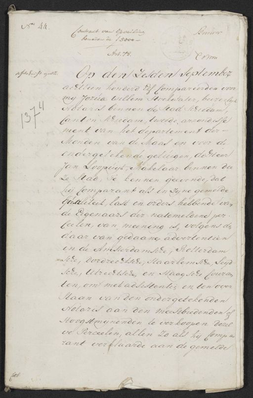 No 44. Contract van Opveiling Bauwer beneden de ƒ 5000- Art. 78. Com. afschrift gesz: Op den Zesden September achttien honderd Elf Compareerden voor mij Jozua Willem Hoekwater, keizerlijk Notaris binnen de Stad Schiedam, Canton Schiedam, tweede arrondisse ment van het departement der= Monden van de Maas en voor de ondergetekende getuigen, de Heer Jan Loop uijt, Makelaar binnen dee„ ze stad, Te kennen geevende, dat hij Comparant als in zijne gemelde Gustiteit, last en orders hebbende van de Eigenaars der natemeldene per- ceelen, van meening is, volgens de daar van gedaane advertentien in de Amsterdamsche, Rotterdam sche, dordrechtsche, Haarlemsche, Leyd schen, Utrechtsche en staagsche Couran ten, om met adsistentie en ten over staan van den ondergetekenden Notaris aan den meestbiedenden of Hoogstmijnenden te verkoopen dezel¬ ve Perceelen, allen zo als hij Compa rant verklaarde aan de gemelde sal