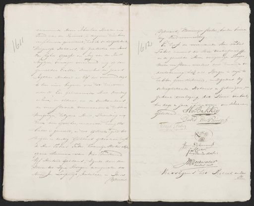 voorndemde Heren Abraham Bakker en David van den Pauwert, in dergelver hier boven omschrevene qualiteit, heb ik ondergetekende Keigerlijk Notaris, ter praesentie van Jacob van Ceijhon oppasser en Arij van der Most Arijszoon, onroeper voorneemd mij op den gemelden Eersten November des Jaars Agttien Honderd en Elf des voormiddags te tien uren begeven voor het hiervoren onder N. Een geenarreerde Huis, Branderij en Erve, en aldaar, na de omstanders de vorenstaande voorwaarden te hebben Voorgelegen, hetgeene Huis, Branderij en Erve doen opveiten, waarvan hoogste bieder is geweest, en het opsteek-geld tot negen en dertig Guldens getrokken heeft de Heer Tobias Faber, kooruijn staker alhier op ene summa van Vier Duizend Vijf Honderd Guldens, zijnde door den- zelven tot Zijne Borgen aangeweten de Heren Jan Loop uijt, hakelaar, en Jan Dijkmans Dijkmans, Koornuijnstaker, beiden binnen dege stad woonachtig. En heeft de voornoemde Heer Tobias Faber, nevens de Heren verkopers qq en de gemelde Heren aangewezen Borgen Welke verstaan worden door hunne in dertekening zich als Borgen in dezen te hebben geconstitueerd, mitsgaders wij ondergetekende Notaris en getuigen, na gedane voorlezing, dit Proces verbaal ten dage en Jare hier voren omschreven Ab: Bakken getekend David v.der Pauwerts Tobias Baben P: vrouwe Mij Jan Dijkmans J:V:Culor trij van der Mostaes J:W: Hoekwater keizerl. nots. Vervolgens het Perceel onder N.