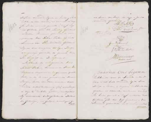 dit Proces-verbaal, ten dage en Jare N. Twee vermeld, zijnde een konterij en have voormeld, getekend hebbende doen verken, is daarvan de voog. Abm. Bakken ste Bieder al mede geweest en heeft algo Dabid vdes Pauwert het opsteek-geld tot Twintig Guldens 99 en zestien stuivers getrokken de voor- Tobias Faberij noemde Heer Tobias Faber, op ene H.H.P. Summa van Twee Duizend Guldens, Jan Dijkmans zynde door dergelven tot zijne Borgen J.r.Cirlor fryvander Most as aangewezen geworden, de gemelde Heren J:W: Hoekwater. Jan Loopuijt en Jan Dijkmans Keizerl. Nots. Hebbende de meergenoemde zeer Tobias Faber, benevens de Heren Ver kopers in derzelver meergemelde quali„ Daarna Ons begeven hebbende voor de Percelen onder N. teit, en de zo even genoemde Heren Drie in het brede vermeld, zijnde Twee Borgen, welke verstaan worden door stuigen en Erven, en dezelven hebbende doen hunne ondertekening, zich als Borgen opveelen, is door van wederom de hoog¬ in degen te hebben gesteld, nudsgaders ste bieder geweest en heeft mitsdien het Wij voornoemde ondergetekende Notaris opsteek geld tot Vijf Guldens en Vier en getuigen, na gedane voorlezing stuivers getrokken de te meermalen dit gemelde