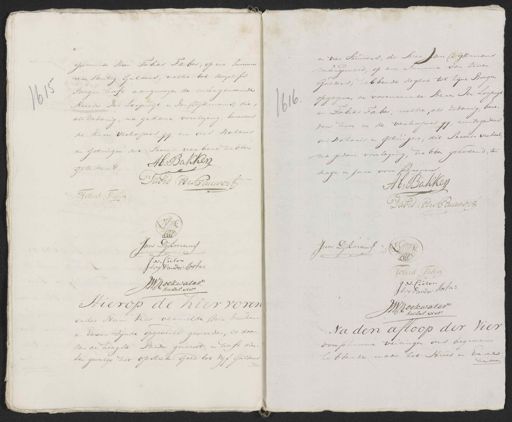 gemelde Heer Tobias Faber, op ene Summa van Twintig Guldens, welke tot deszelfs Borgen heeft aangewegen de meergenoemde Heren Jan Loopuijt en Jan Dijkmans; die, als zodanig, na gedane voorlezing, benevens de Heren Verkopers qq en ons Notaris en getuigen dit Proces verbaal hebben Ab: Bakker getekend. David vder Pauwertz Febias Babon en vier Stuivers, de Heer Jan Dijkmans meergemeld, op ene summa van zeven Goeders; hebbende dezelve tot zijne Borgen opgegeven de voornoemde Heren Jan Loopuyt 16 en Tobias Faber „ welke, als zodanig, bene¬ vens hem en de verkopers qq, midgaders ons Notaris en getuigen, dit Proces-verbaal na gedane voorlezing, hebben getekend, ten dage en Jare voorschreven S.H. Jan Dijkmans J. v. Culon Dry vander Mosta¬ Oekwater J.W.H. Meizerl. Nots. Hierop de hier voren onder Num: Vier vermelde Drie keukens en Erven zijnde opgeveild geworden, is daar van de hoogste Bieder geweest, en heeft dien ten gevolge het opsteek- Geld tot Vijf Guldens Ab. Bakken David vder Pauwort Jun Dijkmans Tobias Faber J. v. Cietou trij van der Mosta¬ Hoekwater J.W.F. peizerl. Nots. Na den afloop der Vier voorschrevene veilingen ons begeven hebbende naar het Huis en Erve verboven