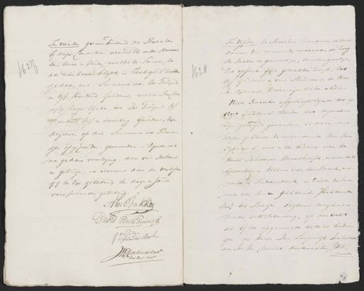 Ten Vijfde, De Percelen hiervoren inder Ten vierden gecombineerd de Percelen Numero Vier vermeld, waarvan de hoog bij dezen Conditien vermeld in den Numeris ste Bieder is geweest, en, dientengevolge, Een, twee en drie, welke te samen, zo het opsteek geld getrokken heeft, tot als hier boven blijkt, in Trekgeld hebben 1628 vijf guldens en vier Stuivers, de Heer gedaan, ene Summa van Zes Duizend Jan Dijkmans, Koernuynstoken alhier en vijf Honderd Guldens; welke Percelen Welk Perceelen afgeslagen zijnde tot op afgeslagen zijnde, tot zes duizend vijf Agt Guldens, zonder dat dezelven honderd Vijf en twintig Guldens, zijn zijn gemijnd geworden, is daarvan dezelven op die Summa van Pernen koper gebleven de voornoemde Heer Jan gen opgezonden geworden. Zijnde dit Dijkmans, voor en ten behoeve van de Heren Johannes Brooshoofd, wonende te na gedane voorlezing, door ons Notaris Giesendam en Willem van den Broek, woen getuigen, na alvorens door de verkopen nende te Riddenkerk, en zulks ter Sum. 99 te zijn getekend, ten dage en Jare ma van zeven guldens. stellende voorschreven getekend zich tot Borgen, blijkens dergeeven Ab. Bekken mede-ondertekening, op den voet David vder Pauwert als bij de opgemelde acte is bedon J. v. Ceibon tig van der Mostas gen, de Heren Jan Loopuijt Aakelaar en Mr. Jan Daniel Hoekwater JWt, Hoekwater. mede keizerl. nots.