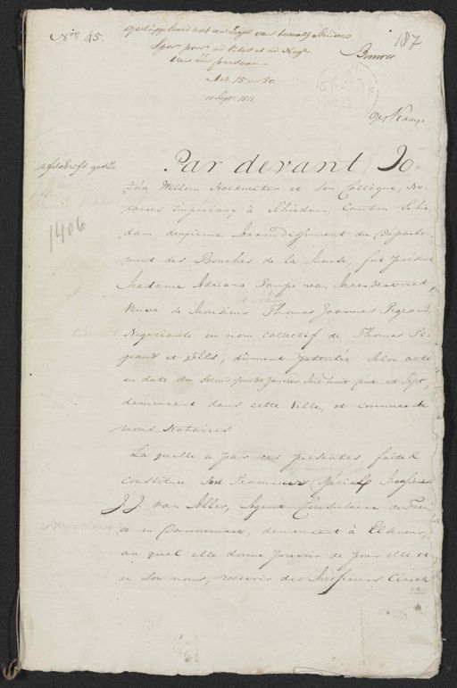 Gesuppleerd met een Zegel van twaalf Stuivers No. 45. 187 specr. procn. ad lites et ad Negen Bauwer van één persoon Art. 15 en 80. 11 Septr. 1811. Verkäntje Par devant Jo¬ afschrift gesz. zua Willem Hoekwater et son Collègue, No¬ toutes les taires impériaux à Schiedam, Canton Schie¬ 140 dam, deuxieme Arrondissement du Departi¬ ment des Bouches de la Meuse, fut présent Madame Adriana Tompe van Meerdervoort + Mts Veuve de Monsieur Thomas Joannes Pegeaud, C. de Negociante en nom collectif de Thomas Pi¬ geand et Fels, dument patentee selon acte en date du second jour de Janvier, mil huit Cent et Sept demeurant dans cette ville, et comme de nous Notaires. La quelle a par ces présentes, faite & constituée son Procureur spéciale Monsieur I: J: van Aller, Agent Consulaire de Fran¬ Monsieur ce en Dannemarc, demeurant à Elseneur, au quel elle donne pouvoir de pour elle et en son noms; recevoir des Messieurs Clarck et