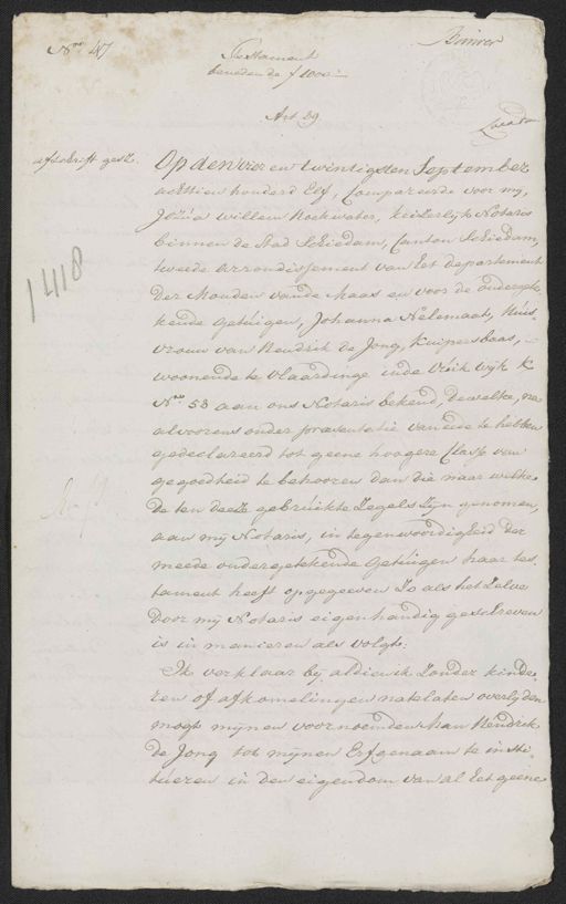 Bauwer No„ 47 Testament beneden de ƒ 1000: Art 39. sonden afschrift gesz Op den vier en twintigsten September achttien honderd Elf, Compareerde voor mij, Jozua Willem Roekwater, keizerlijk Notaris binnen de stad, schiedam, Canton, Schiedam,, tweede arrondissement van het departement der Monden vande Maas en voor de ondergetee kende getuigen, Johanna Nelemaat, Huis¬ vrouw van Hendrik de Jong, kuippersbaas, woonende te vlaardinge inde vuik wijk k No. 53 aan ons Notaris bekend, dewelke, na alvoorens onder praesentatie van eede te hebben gedeclareerd tot geene hoogere Classe van gegoedheid te behooren dan die naar welke de ten deeze gebruikte zegels zijn genomen, aan mij Notaris, in tegenwoordigheid der meede ondergetekende getuigen haar tes tament heeft opgegeeven zo als het zelve door mij Notaris eigenhandig geschreven is in manieren als volgt: Ik verklaar bij aldien ik zonder kinde ren of afkomelingen natelaten overlijden mogt mijnen voornoemden Man Hendrik de Jong tot mijnen Erfgenaam te insti¬ tueren in den eigendom van al het geene