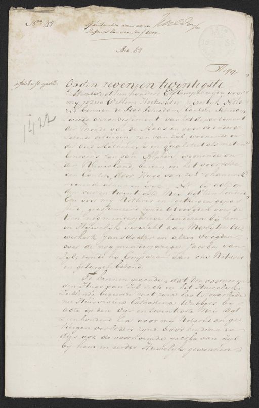 No 48 quitantie van eene Kilderije de voir de Erfenis beneden de ƒ 1000- hij des Art. 68 No. 1441 afschrift gesz: Op den zeven en twintigste sebtember agt tien honderd Elf Compareerde voor mij Jozua Willem Hoekwater, keizerlyk Nota ris binnen de stad schiedam Canton Schiedam tweede arrondissement van het departement der Monde van de Maas en voor de onderge„ 1 tekende getuigen Jan van zijl, woonende on der Oud Mathenesse in qualiteit als met en benevens Jan van Alphen, woonende on der Nieuwland, beiden in het voorschre¬ den Canton, door Hugo van zyl Johannesz woonende alhier in wyk N=o bij acte op den vier en twintigste Meij agt tien honderd Een voor mij Notaris en getuigen gepas seerd, geassumeerd zynde tot voogden over de toen nog minderjarige kinderen bij hem in Huwelijk verwekt aan Marytje du werkerk Jans dochter en alzoo voogden over de nog minderjarige Jacoba van Zijl; zijnde hij Comparant aan ons Notaris en getuigen bekend. Te kennen gevende dat den voornoem¬ den Hugo van Zyl zich in het Huwelyk zullende begeeven met zyne laatst overleede ne Huisvrouw Catharina Wubbers bij acte op den vier en twintigste Meij agt tienhonderd Een voor mij Notaris en ge tuigen verleden zyne voor kinderen en dus ook de voornoemde jacobavan zyl bij hem in eerder Huwelyk gewonnen
