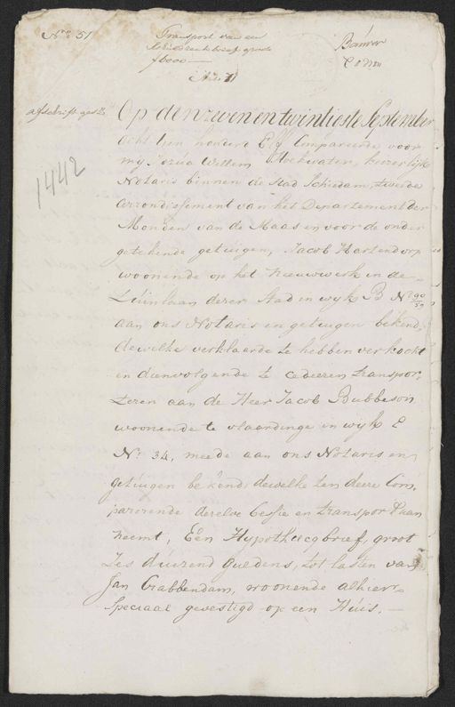 Transport van een No„ 51 Bauver Schuldrentebrief groote ƒ 6000 Cadron Art 71 afschrift gesz Op den zeven en twintigste September acht tien honderd Elf Compareerde voor mij Jozua Willem Hoekwater, keizerlijk Notaris binnen de stad Schiedam, tweede Arrondissement van het Departement der Monden van de Maas en voor de onder getekende getuigen, Jacob Hartendorp woonende op het Nieuwwerk in de Luinlaan dezer Stad in wijk B N=o 90/32 aan ons Notaris en getuigen bekend, dewelke verklaarde te hebben verkocht en dienvolgende te cedeeren transport¬ teren aan de Heer Jacob Bubbeson, woonende te vlaardinge in wijk E. No: 34, meede aan ons Notaris en getuigen bekend, dewelke ten deeze Com¬ parerende dezelve bessie en transport aan neemt, Een Hypotheecq brief, groot Zes duizend guldens, tot lasten van Jan Crabbendam, woonende alhier speciaal gevestigd op een Huis,
