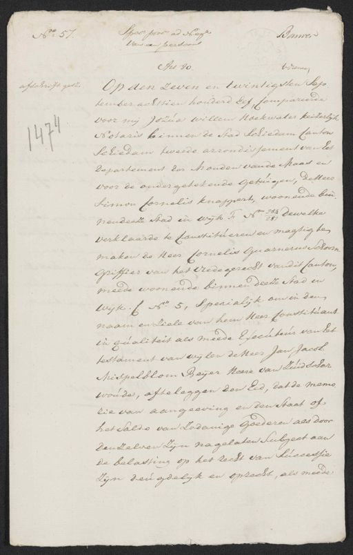 spec: procr. ad Nega. Bauwer No„ 57. van een persoon Art 80. Vereuwen Op den zeven en twintigsten Sep¬ afschrift gesz. tember achttien honderd Eef, Compareerde voor mij Jozua willem Hoekwater keizerlijk Notaris binnen de Stad Schiedam Canton Schiedam, tweede arrondissement van het departement der Mouden van de Maas en voor de ondergetekende getuigen, de Heer Simon Cornelis knappert, woonende bin¬ 28 dewelke nendeeze stad in wijk F N 287 verklaarde te Constitueren en magtig te maken de Heer Cornelis Guarnerus Schoorn griffier van het vredegerecht van dit Canton meede woonende binnen deeze stad in wijk. C No. 5, specialijk om in den naam en ziele van hem Heer Constituant in qualiteit als meede Executeur van het testament van wijlen de Heer Jan Jacob Mispelblom Beijer Heere van Zuidschar woude, afteleggen den Eed, dat de memo¬ zie van aangeeving en den staat of het saldo van zodanige goederen als door denzelven zijn nagelaten subject aan de belasting op het recht van successie zijn deugdelijk en oprecht, als meede