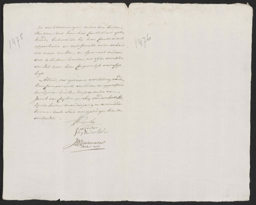 de verklaaringen onder die beiden stukken door hem her Constituant gete„ kend; belovende hij heer Constituant approbatie en ratificatie onder verband als naar rechten, en speciaal het daar voor te zullen houden, als of de voorschre ven Eed door hem Corporalijk was of ge legt Aldus, na gedaane voorlezing aanden Heer Comparant, verleden en gepasseerd ten zijnen huize, ter præsentie van Jacob van Ceijlon en Arij van der Most Az. zijnde beiden meerderjarig en woonende binnen deeze stad, als getuigen hier toe verzocht. J. Wmappe A. qq J: v: Cailon Dry van der Most, als J: W: Z: oekwater. Keizerl. Nots.