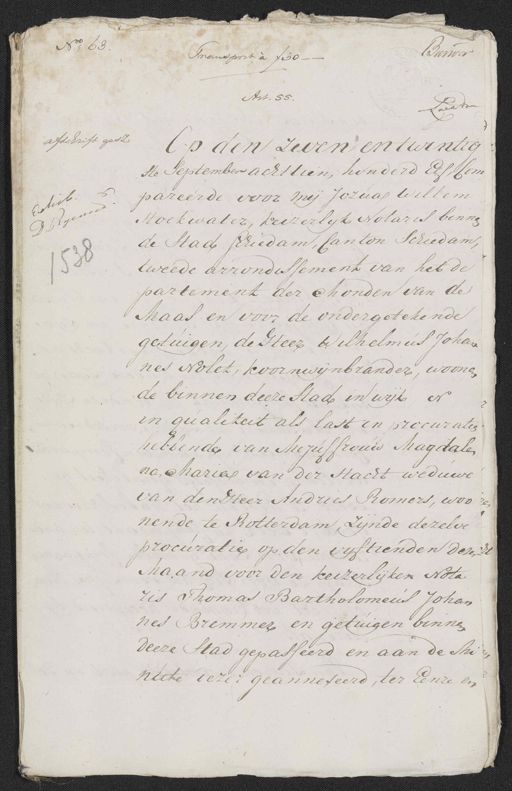 No: 63. Bauwer Transport à ƒ 30. Art. 55. Luerton afschrift gesz Op den zeven en twintig ste September achttien honderd Eef, Com¬ Eschib. & pareerde voor mij Jozua Willem D Pigeand Hoekwater, Keizerlijk Notaris binnen de stad schiedam, Canton Schiedam 138 tweede arrondissement van het de partement der Monden van de Maas en voor de ondergetekende getuigen, de Heer Wilhelmus Johan nes Nolet, koornwijnbrander, woonen =de binnen deeze stad in wijk is in qualiteit als last in procuratie hebbende van Mejuffrouw Magdalen na Maria van der Hacht weduwe van den Heer Andries Romers, woore nende, te Rotterdam, zijnde dezelve procuratie op den vyftienden desen Maand voor den keizerlijken Nota ris Thomas Bartholomeus Johan nes Bremmer en getuigen binnen deeze stad gepasseerd en aan de Mi„ nute dezer geannexeerd, ter Eenre en