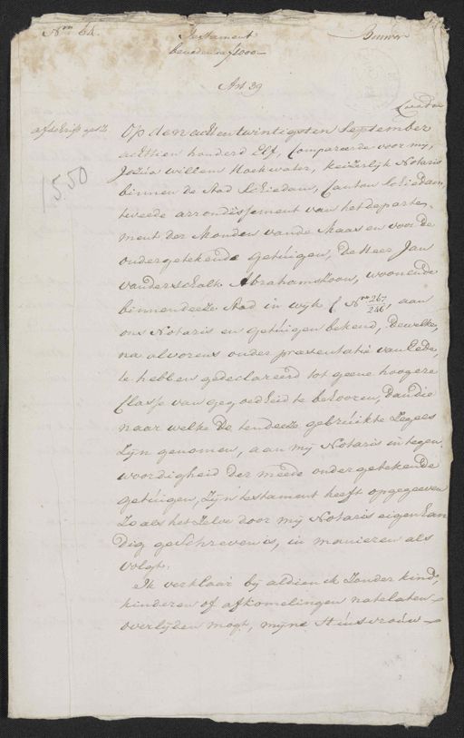 No. 64. Testament Bouwer benedende ƒ1000- Art 39 Coerdon Op den achtentwintigsten September afschrift gesz. achttien honderd Elf, Compareerde voor mij, Jozua Willem Hoekwater, Keizerlijk Notaris binnen de stad schiedam, Canton Schiedam tweede arrondissement van het departen ment der monden vande Maas en voor de ondergetekende getuigen, de Heer Jan van der schalk Abrahamszoon, woonende binnen deeze Stad in wijk C Nro. 267 aan 246 ons Notaris en getuigen bekend, dewelke, na alvorens onder praesentatie van Eede te hebben gedeclareerd tot geene hoogere Classe van gegoedheid te behooren, dan die naar welke de tendeese gebruikte zegels zijn genomen, aan mij Notaris in tegen woordigheid der meede ondergetekende getuigen, zijn testament heeft opgegeeven zo als het zelve door mij Notaris eigenhan¬ dig geschreven is, in manieren als volgt: Ik verklaar bij aldien ik zonder kind, kinderen of afkomelingen natelaten, overlijden mogt, mijne Huisvrouw —