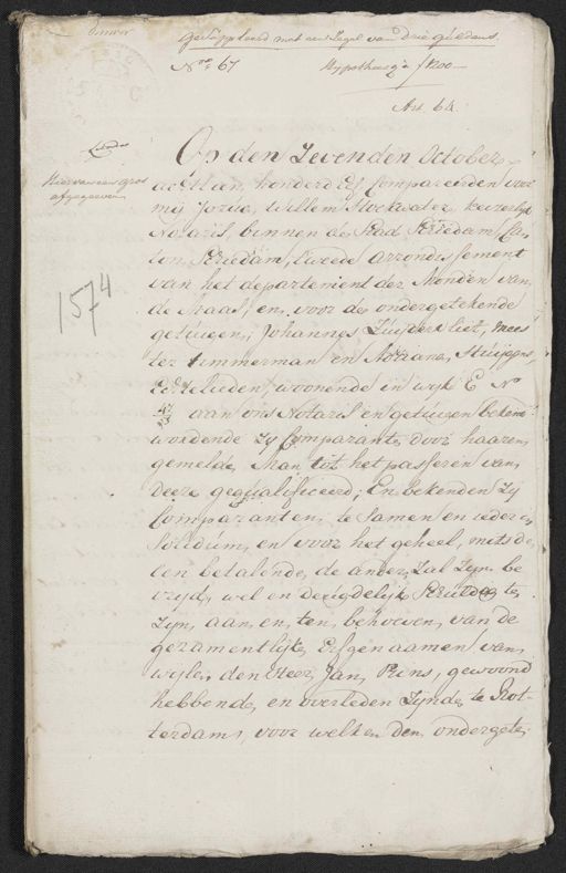 Bouwer Gesuppleerd met een zegel van drie guldens. Nijpotheerg à ƒ 1200- No. 67 Art. 64. Lolada Op den Zevenden October — Hier van een gros achttien honderd Eel, Compareerden voor afgegeeven mij Jozuen Willem Hoekwater, keizerlijk Notaris, binnen de Stad Schiedam, Can ton, Schiedam, tweede arrondissement van het departement der Monden van de Maas, en voor de ondergetekende getuigen; Johannes Zuijders liet, mees ter timmerman en Adriana stuijgens, Echtelieden, woonende in wyk E N 47 aan ons Notaris en getuigen bekend wordende zy Comparante door haaren gemelde Man tot het passeren van deeze gequalificeerd; En bekenden zij Comparanten te samen en ieder in solidum, en voor het geheel, mits de een betalende de ander zal zyn be vrijd, wel en deugdelijk schuldig ten zijn aan en ten behoeven van de gezamentlijke Erfgenaamen van wijlen den Heer Jan Prins, gewoond hebbende, en overleden zijnde te Rot= terdams, voor welken den ondergete: