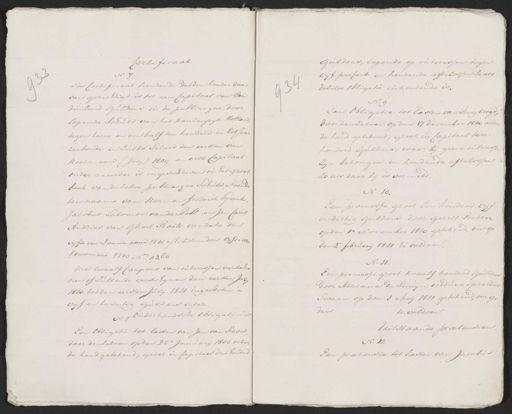 Certificaat. N. 7. Een Certificaat houdende dat den houder daar van gezechtigd is tot een Capitaal van Een duizend guldens in de publiecque door lopende schuld van het koningrijk Holland, tegen twee en een half ten honderd in het Jaar rentende en zulks Sederd den eersten van Nooimaand (Julij) 1809 en welk Capitaal onder meerder is ingeschreven in het groot boek van dezelve publiechne schuld staande ten naame van Herman frederch Tjeenk, Jacobus Salomon van der Poll en Jan Carel Andzies van Gheel Roëll van dato den Guldens, lopende op interessen tegen vijf percent en houdende aftelossen zo als dezelve obligatie inhoudende is. 6e No. 9 Een Obligatie tot lasten van Burg voogd, door den zelven op den 17 december 1810 onder de hand getekend, groot in Capitaal twee honderd Guldens, waar bij geene interessen zijn bedongen en houdende aftelossen zo als daar bij is vermeld. No: 10. Een promesse groot Een honderd vijf en dertig guldens door gerrit Bakker op den 1.e November 1810 getekend, om op den 2e februarij 1811 te voldoen. vijfde van Louwmaand 1810 exhibitum den vyfde vam Louwmand 1810 Nro. 9460. Met twaalf Coupons van interessen verschee nen of zullende verschijnen den eersten July 1810 tot den eersten Julij 1821 ingeseoten a vijf en twintig Guldens ieder N. 8 Onderhandsche Obligatien 20. Een Obligatie tot lasten van Jan van Stavel door denzelven op den 25e. Januarij 1805 onder de hand getekend, groot in Capitael drie honderd N. 11. Een promesse groot twaalf honderd guldens door Adriana de Bruijn weduwe gerardus swaan op den 1 Meij 1811 getekend, om op den te voldoen Uitstaande praetensien No. 12. Een prætensie tot lasten van Jacobus