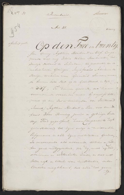 No: 21 Bauwer Inventaris Art. 48. odeemen afschrift gesz. Op den Twee en twintig¬ =sten Junij Agttien Honderd en Elf, Compa reerde voor mij Iotua Willem Hoekwater kei- zerlijk Notaris te Schiedam, ter praesentie van de nabeschreven Getuigen, Mejufvrouw Adriana de Bruijn, weduwe van Gerardus Swaan, wonen= de binnen deze stad, op de Gooistraat, in Wijk C. N: 337, Te kennen gevende, dat haar voornoemde overleden man, bij deszelfs testa¬ ment op den zes en twintigsten van zentemaand Maart Agttien Honderd en Tien, voor den No¬ taris Isaac Penning Junior en getuigen binnen deze stad gepasseerd, haar Comparante heeft geinstitueerd tot zijne enige en universele Erfgename in alle zijne natelatene Goederen zo onroerende als roerenden, actien en Credi¬ ten gene uitgezonderd, die hij, met zij dood ontruimen en achterlaten zoude, en dat met volle regt en titule van institutie onder conditie nogthans, dat alle het geen zij