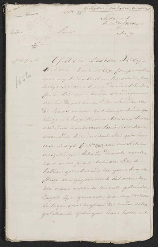 gesuppleerd met een Zegel van tien guldens. No. 24. Bauwer Testament beneden de ƒ 50000„ Meyers Art. 39 Laerson afschrift gesz. Op den zesden Julij Achttien honderd Elf, Compareerde 8. voor mij Jozua Willem Noekwater, kei„ zerlijk Notaris binnen de Stad Schiedam„ Canton Schiedam, tweede arrondissement van het Departement der Monden van de Maas en voor de ondergetekende ge tuigen, Mejuffrouw Adriana Sonne weduwe van de Heer Leenderd Verhave, woonende binnen deeze stad op de broes¬ vest in wijk C: No. 393 aan ons Notaris en getuigen bekend, dewelke na alvo„ rens onder preesentatie van Eede te hebben gedeclareerd tot geene hoogere Classe van gegoedheid te behooren dan die naar welke de tendeze gebruikten zegels zijn genomen, aan mij notaris in tegenwoordigheid der meede ondere getekende getuigen haar testament