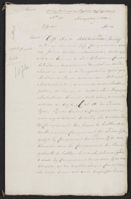 Bauwer Geduppleerd met een Zegel van Vijf Guldens. No. 25. Transport à ƒ 2150 - „- dikotas Art. 55. Bouwes Op den dertiende Iulij achttien honderd Elf Compareerden voor 't gesz. mij Jozua Willem Hoekwater, keizerlijk Notaris binnen de Stad Schiedam, Canton schiedam, departement der Mouden van de 16. Maas en voor de ondergetekende getuigen; Anthonia Lande weduwe van Schrevel Middelhuizen, woonende onder Babbers¬ polder, ter Eenre, en de Heer Jan Loopuijt, makelaar binnen deeze stad, woonende alhier in wijk C. N. 18. ter andere zijde, zijnde beiden de Comparanten, aan mij Notaris bekend; En verklaarde de Comparante ter Eenre te hebben ver¬ kocht aanden Comparant ter andere zijde, gelijk hij Comparant ter andere zijde ver¬ klaarde van de Comparante ter Eenre gekocht te hebben het nabeschreven goed, 't welk hij Comparant ter andere zijde ver¬ klaarde op de natemeldene Conditien, zo voor hem als voor desselfs Erven