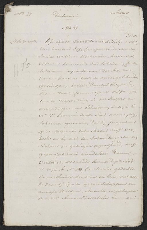 Bunor No„ 27 Declaratoir Art. 82 Cammer afschrift gesz. Op den zeventiende Julij acht¬ tien honderd Elf, Compareerde voor my Jozua Willem Hoekwater, keizerlyk Notaris binnen de Stad Schiedam, Canton 66 Schiedam, departement der Monden¬ van de Maas en voor de ondergetekende getuigen; de Heer Daniel Rigeand, Thomaszoon, Commissaris ontfanger van de Verponding in het Ressort en arrondissement Schiedam, in wijk E. N.r 77 binnen deeze Stad woonagtig, Te kennen geevende, dat hij Comparant op den Zestiende dezer Maand heeft ver kocht en bij acte ten zelven dage voor mij Notaris en getuigen gepasseerd, heeft getransporteerd aan de Heer Daniel — Verlouw, woonende binnen deeze Stad in wijk A. N.o 243, Een tiende gedeelte in een Loodwitmolen en Erve, met alle de daar bij zijnde gereedschappen en annexe Huisjes, staande en gelegen in het S. Anna Zusterhuis binnen