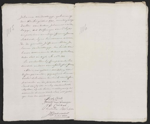 Johanna vander Stegge, gebooren op den 16e. Augustus 1790, minderjarige dochter van de Heer Johannes vander Hegge, oud ontfanger van's Rijks 46 impositien en Mejuffrouw Janna Lokhorst, Zijne Huisvrouw, woonen¬ de de gemelde Juffrouw Alida Jo¬ hanna van der Stegge, ten huize van haare voornoemde ouders op de haven dezer stad in wijk A. No. 233. En verzochten Zij Comparanten hier, van acte en daar van afschrift in forma. Aldus, na gedaane voorlezing aan de Comparanten, gepasseerd binnen de stad schiedam, ten huize van de Com¬ paranten en ter preesentie van Jacob van Ceijlon en Arij van deze host¬ Arijszoon, zijnde beiden meerderjarig en woonende binnen deeze Stad, als getui¬ gen hier toe verzocht. Jacob Poort Jannetje van Wieringen J. V. Cerbon Huyvander Moster Loon Hoekwater. J:M: keilerl Nots.