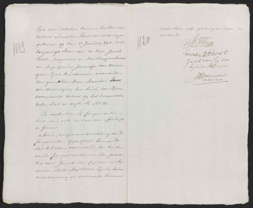 lijk van dezelve Hunne Dochter met de Heer Maarten Poort van wieringen gebooren op den 2e. Januarij 1792, min¬ M derjarige zoon van de Heer Jacob Poort, koopman en Houtzaag molenaar en Mejuffrouw Jannetje van wierin gen, zijne Huise roem, woonende den gemelden Heer Maarten Poort van wieringen, ten huize van zijne voornoemde ouders op het nieuwwerk dezer Stad in wijk B. No. 75. deeze stad, als getuigen hier toe verzocht. 1,20 J: W.D.Hagen 1660 get. Janna Jokhorst Jacob van Ceiton Mij van der Most a zoon Hoekwater J:H: Keizerl. Nots. En verzochten Zij Comparanten — hier van acte en daar van afschrift in forma Aldus, na gedaane voorlezing aan de Comparanten, gepasseerd binnen de Stad Schiedam voornoemd, ten huize van de Comparanten en ter praesen¬ tie van Jacob van Ceijlon en Arij van der Most Arijszoon, zijnde beiden meerderjarig en woonende binnen