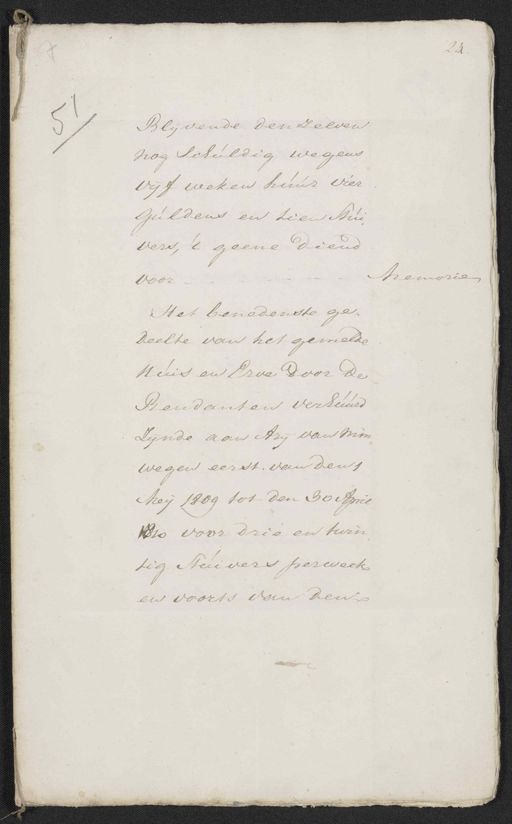 Blijvende denzelven nog schuldig wegens vijf weken huur vier Guldens en tien stui¬ vers, 't geene diend voor Het benedenste ge¬ deelte van het gemelde Huis en Erve door de 24 Memorie Rendanten verhuurd Zijnde aan Arij van min¬ wegen eerst van den 1 Meij 1809 tot den 30 April 1810 voor drie en twin tig Stuivers per week en voorts van den