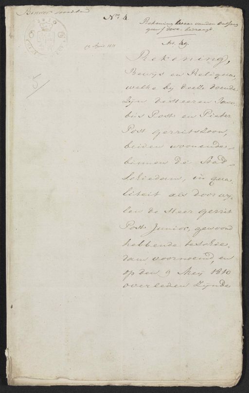 Bouwer und No. 4. Rekening waar van den ontfang geen f 8000 - bedraagd Art. 49. 19 April 1811 Rekening Bewijs en Reliqua welke bij deeze doende zijn desteeren Jaco¬ bus Post en Pieter Post Gerritszoon beiden woonende, binnen de Stad. Schiederin, in qua liteit als door wij¬ len de Heer Gerrit Post Junior, gewoond hebbende teschie¬ dam voornoemd en Op den 9 Meij 1810 overleden zijnde