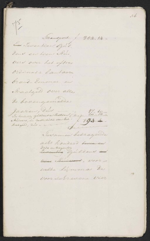 36 Transport. x 854„14 En Zeventien Gul¬ deux en tien stui vers over het extra ordinair lantaarn brand-Emmer en straatgeld over alle De bovengemelde Jaaren, dus 17.10 En twintig guldens en zestien @ 20 „ 16 stuivers, in restitutie van het 893„4 wekgeld, dus Ain tesamen bedragende acht honderd twee en drie en negentig zeventig Guldens en Vier Stuivers, voor — welke summa de voorschrevene vier