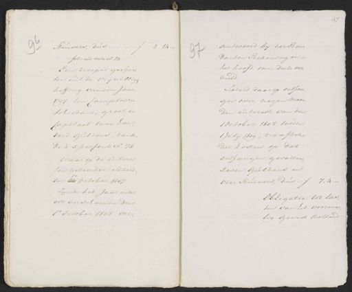 Stuivers, dus 96 folio eod. verso N. 23. Een recepis gespre¬ ten uit de vrijwilligen heffing van den Jaare 1797 ten Comptoire Schiedauw, groot in Capitaal twee Lond derd Guldens, renten de à 5 percent N 75. waar op de interes sen zesteerden sederd, den 22 October 1807 zijnde het Jaar inter¬ est verscheenen den 1e October 1808 ver¬ antwoord bij der Reu¬ 2. 14 — 97 Danten Rekening in het hoofd van deeze ver¬ meld. Sederd daarop ontfan¬ gen over negen maan¬ den interest van den 1 October 1708 tot den 1 Julij 1809, na aftrek der kosten op dat ontfangen gevallen Zeven Guldens en Vier Stuivers, dus — ƒ 7„4- Obligatie tot las¬ ten van het voorma¬ lig gewest Holland