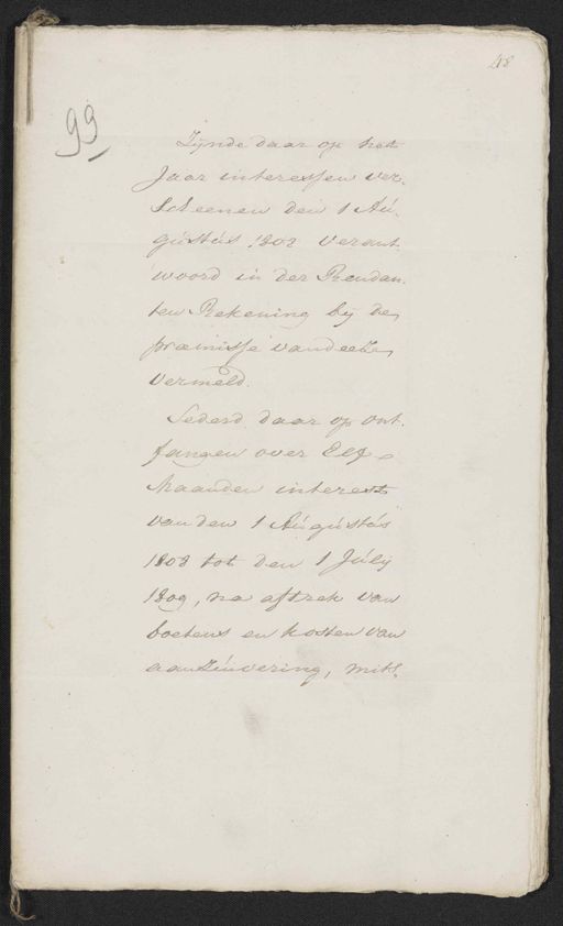 48 Zijnde daar op het Jaar interessen ver¬ scheenen den 1 Au¬ gustus 1808 Verant. woord in der Rendan. ten Rekening bij den praemisse van deezen Vermeld. Sederd daar op ont¬ fangen over Elf Maanden interest van den 1 Augustus 1808 tot den 1 Julij 1809, na aftrek van boetens en kosten van aanzuivezing, mits¬