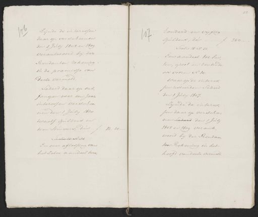 Zijnde de interessen 106 daar op verscheenen den 1 Julij 1808 en 1809 verantwoord bij der Rendanten rekening in de praemisse van deeze vermeld. Sederd daar op ont¬ fangen over een Jaar interessen verschee nen den 1 Julij 1810 twaalf guldens en tien stuivers, dus- Folio 15 N. 31. En over aflossing van het zelve aandeel twee honderd en vijftig 107 Guldens, dus 250 Polio 15 Nr. 31. Een aandeel tot las ten, groot en rentende als vooren N. 10. Waar op de interes. jen zesteerden Sederd den 1 Julij 1807. zynde de interes¬ jen daar op verschee¬ nen Sederd den 1 Julij 1808 en 1809 verant¬ 12. 10 woord bij der Rendan. ten Rekening in het hoofd van deeze vermeld.
