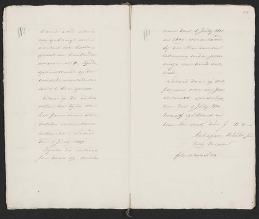 Voorts word alhier 10 nog gebragt een — aandeel tot lasten, groot en rentende als vooren N. 12, zijnde geömitteerd op den voorschreven Inven¬ taris te brengen Waar op de inter¬ essen ten tijde van het formeren van dezelve inventaris resteerden Sederd den 1 Julij 1807 zijnde de interes¬ sen daar op verschee¬ 54. nen den 1 Julij 1808 en 1809 verantwoord bij der Rendanten rekening inde prae¬ misse van deeze ver¬ meld. Sederd daar op ont¬ fangen over een Jaar interest verschee nen den 1 Julij 1810 twaalf guldens en tien stuivers, dus 12. 10 Schepen-schuld cus¬ ting brieven folio 15 verso N. 33.
