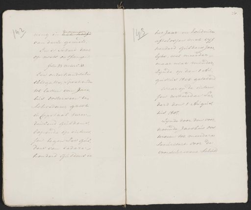 boofd ning in h van deeze gemeld. En is Sederd daar op niets ontfangen. folio 23 verso Nr. 41 Een ouderhandsche obligatie, sprekende tot lasten van Jacob bus oosterveen te Schiedam, groot in Capitaal twee duizend Guldens lopende op interes sen tegen zes gul¬ deus van iedere honderd Guldens in 70 het Jaar en houdende 143 aftelossen met vijf honderd guldens jaar lijks, wel meerder maar niet minder zijnde op den 1 Au¬ gustus 1805 getekend. waar op de interes. jen resteerden se¬ derd den 1 Augus. tus 1807. Zijnde door den voor noemde Jacobus oos terveen tot meerdere Securiteijt voor de voorschrevene schuld