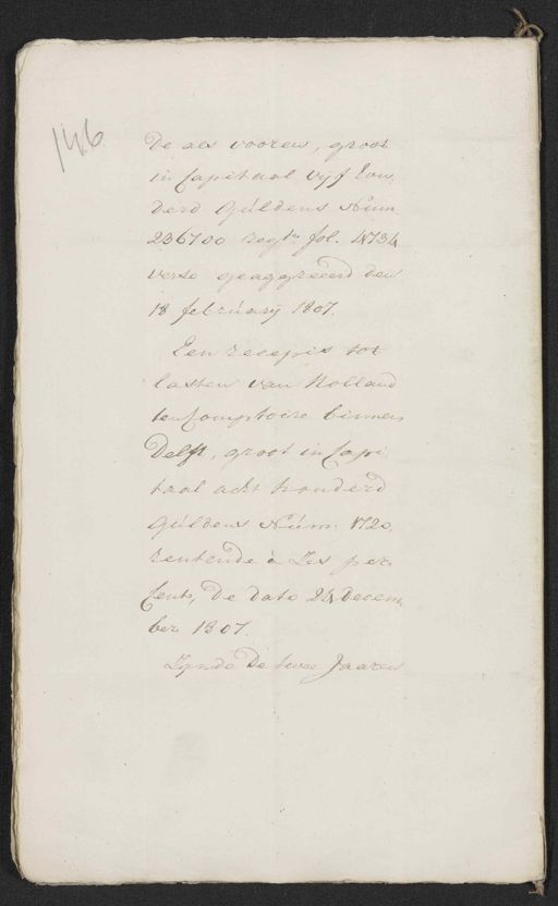 V. de als vooren, groot in Capitaal vyf hou¬ derd Guldens Num: 236700 regte fol. 4734 verso geaggreeerd den 18 february 1807 Een recepis tot lasten van Holland ten Comptoire binnen Delft, groot in Capi¬ taal acht honderd Guldens Num: 1720 rentende a zes per¬ sent, de date 24 decem¬ ber 1807. zijnde de twee Jaaren