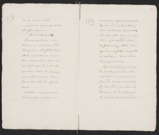 Deeze vermeld Sederd daar op niets Ontfangen folio eod. verso N. 44. Een acceptatie door Hermanus van Bol¬ Es op den 15: februarij 1808 getekend om Zes Macenden daar na en dus op den 15 Au¬ gustus 1808 te betalen eene summa van drie duizend Gul¬ Deus, welke acceptatie successivelijk in anderen geconverteerd 54 zijnde, in plaatse van dezelve tans voor¬ handen is eene accep. tatie getekend den 11 februarij 1810 om op den 11 february 1811 te voldoen drie dui¬ Zend Guldens. Zijnde het geene op de eerst gemelde ac: ceptatie is geperci. pieerd verantwoord bij der Rendanten te kening in de preemis¬ je van deeze vermeld